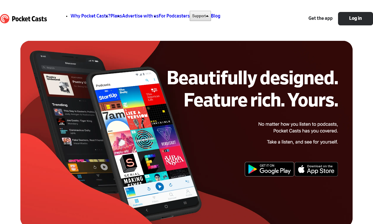 Built by podcast listeners, for podcast listeners, Pocket Casts is a critically acclaimed, beautifully designed app that’s on a mission to create the world’s greatest podcasting experience through its free and Pocket Cast Plus tiers. We offer podcast fans more control of their listening experience through features that make it easier to discover and organize podcasts, alongside powerful tools to customize the listening experience. Pocket Casts is available for Android, iOS and web, as well as Amazon Echo, CarPlay, Android Auto, Sonos, Apple Watch, Chromecast, and HomePod (via Google Cast and Airplay 2).
